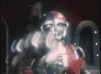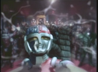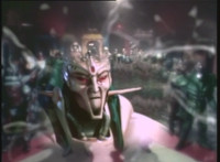 Grimlord's energy summons an energy screen above the mutants in the Dungeon, forming an image of Colonel Icebot as he talks close with a fist raised that he slowly lowers. |