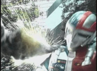 Slashbot stabs forth, so VR Ryan leaps up with his energized hand and energy chops into him, causing Slashbot to crackle. |