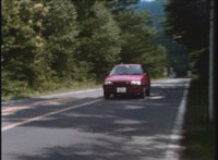 Kaitlin's car speeds past us on the wrong side of a forest-side paved road. |