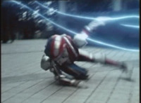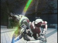 VR Ryan holds his chopping hand up, Slashbot readies his blade, VR Ryan holds his chopping hand forth, Slashbot paces to the side, VR Ryan sizes him up with just his chopping hand, then Slashbot jabs forth. VR Ryan dodges the blow, then another, then juts his hand forth, striking Slashbot in the neck causing him to stagger back. VR Ryan rolls in, blocks his blade, then bops him on the forehead, sending him tumbling. Grimlord gawks. |
