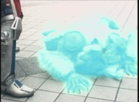 Close on Colonel Icebot, nod-talking and shifting his weight, as the virtual mutants watch from behind the energy screen. |