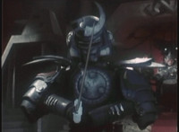Decimator raises his katana, readying it as Grimlord sits behind him. |