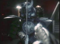 Colonel Icebot talks at us near a console, as the virtual mutants watch from behind the energy screen. |
