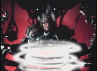 Pan over from a computer console to Grimlord reaching out to it beside his throne. |