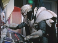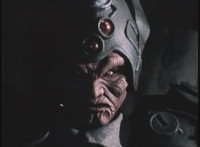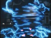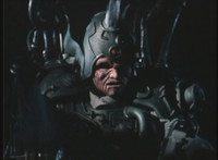 VR Ryan rolls over, but quickly recovers to a crouch, as Grimlord extends a pair of tentacles forth. VR Ryan grabs one ,chops it in half, but the second stabs him sparkily in the waist, causing him pain, and frying one of his robotic components. Grimlord talks during a zoom in, as VR Ryan chops the tentacle in half, then has to remove the pointy end of it from its impaled place in his gut, staggering back. |
