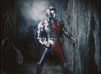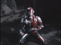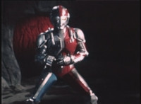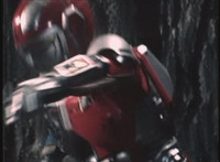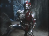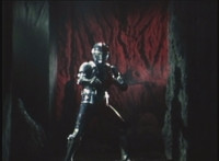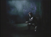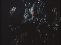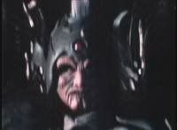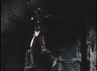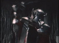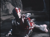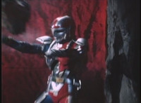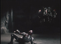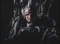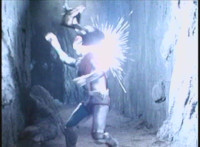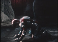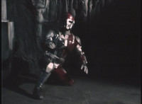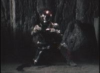 VR Ryan pulls out a dagger, unsheathes it, Decimator readies his katana, as VR Ryan lunges forth and stabs at him, missing completely. Decimator slashes at him, just as he stabs again, both spark bursting upon impact in the darkened cave. A quick shot of the pair of flaming coals, then Decimator glows with multicolored energy, dematerializing entirely, leaving VR Ryan collapsing to the floor. A quick shot of the flaming torch, before Grimlord appears on the throne, VR Ryan trying to recover to a crouch. |