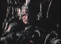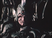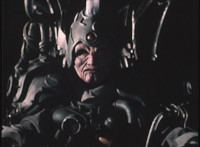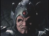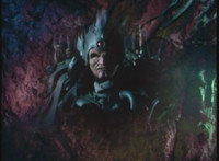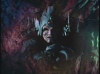 Grimlord talks on his cave throne, glancing to our right as the shot pans over to it, revealing nine virtual mutant heads sitting in front of an open flame. Grimlord gestures forth, causing three of the heads to hover up above the platform. |