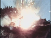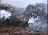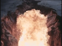 The rockslide keeps pouring, a crevice opens up in the ground and spews up a fireball, as more quaking and earth plate-shifting occurs. |
