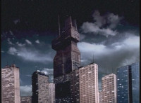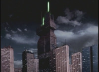 Ziktor Tower at night fires green energy skyward, creating the Dark Fortress, floating through space. Then a static exterior of the smogless Ziktor Tower at night. |