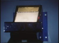 A pink glow sparkles a bit in front of a caged device. |