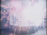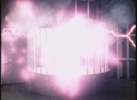 The purple glow subsides as the caged device sparkles and crackles. |