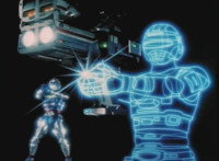 VR Ryan pulls the trigger, causing his giant hologram double to do the same to the VR Shoulder Cannon, firing it forth. |