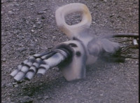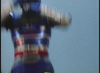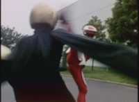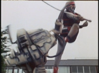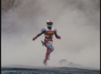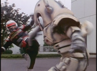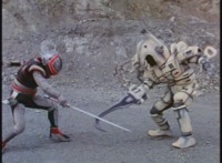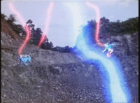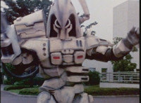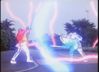 VR JB rolls through the smoke and fires back on Irradiator, bursting both of his arms off! Armless, Irradiator is not harmless, as his dismembered appendages come to life, VR JB reacting, as the arms fly at him. He slashes them down, cutting the hook arm sparkily in half. VR JB poses, leaps up, and slices off Irradiator's head! He lands and poses as the head falls to the ground, only for Irradiator's body to keep walking, VR JB posing defensively. |