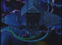 Karl Ziktor morphs into Grimlord, teleporting up to his Dark Fortress above, which floats through the virtual dimension. |