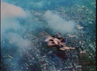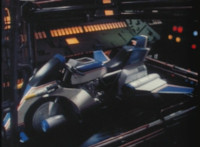 The VR Nitrocycle lowers its wings, then flies forth through its hangar tunnel, then flies down from the VR Shoulder Cannon Shuttle. |