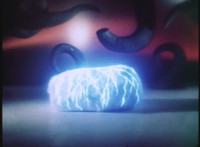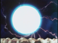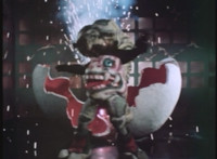 Oraclon's eyes zap electricity into the giant egg, causing it to crackle, then hatch, Silkoid hopping out of it and posing. |