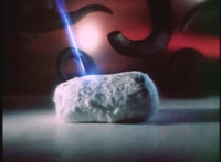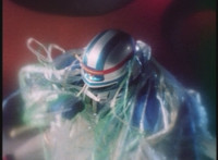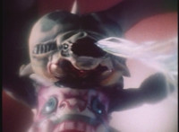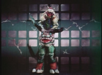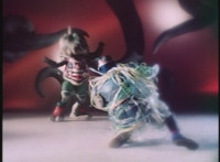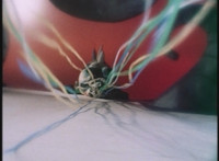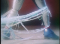 VR Ryan falls through the reality barrier into another dimension, where he lands, glances about, then sees Silkoid spewing colorful ribbons at him, which ensnare his body completely. Silkoid scurries over and knocks VR Ryan over, and he struggles to break free from his multicolored binds, when Silkoid spews some more ribbons around his head. VR Ryan flips and twists about, unable to break free as Silkoid hits him again with more ribbons. VR Ryan falls, and suddenly begins to get webbed up, forming a cocoon around him, Silkoid preparing his staff. |