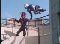 VR Ryan lands in an alley before Doommaster & the Vixens. He immediately begins to fight them, one after another in rapid succession, and when Doommaster slashes, he leaps up atop a nearby roof. |