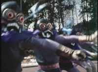 VR Ryan is fighting an Ultra-Skug, when Silkoid comes up from behind and strikes him with his staff, knocking him over the side of the walkway. He lands on a road and recovers, as Doommaster rushes in and slashes at him, only for VR Ryan to block kick, then flip over him, landing, posing, pulling out his Laser Pistol, then firing on him and the Vixens, bursting before them as they scatter. Close-up on Oraclon as he talks and his eyes flash. |