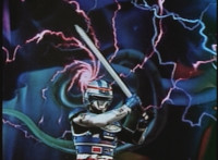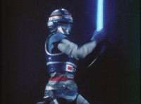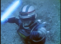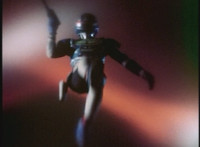 VR Ryan's eyes fade, as he aims his Laser Pistol forth, targeting an empty space, when suddenly Silkoid rematerializes. VR Ryan fires, laser blasting behind Silkoid, causing an explosion that sends him flying forth. VR Ryan reholsters his Pistol, readies his Saber, and rushes forth, as Silkoid falls, only to get slashed by VR Ryan as he passes by him. VR Ryan turns, Silkoid charges at him, so VR Ryan slashes his Laser Saber against a black backdrop three times, then a fourth with added energy, cutting into Silkoid sparkily. |