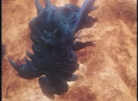 VR Ryan begins to cut through his cocoon with his Laser Pistol. Silkoid reacts, as the blue ray cuts through the cocoon, causing it to crack, then explode, as VR Ryan flips over and lands and turns to face Silkoid. |
