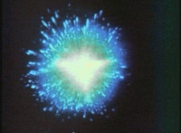 Rapid flashing of a blue burst, as a massive explosion fireball expands before us, briefly flashing blue, then back to normal, then again. VR Ryan turns around and poses with his saber as the strange dimension reverts to the blue skies of reality. |