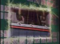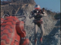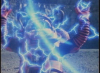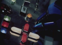 Serpentoid lunges forth, sparkily bashing through VR JB, before heading back the other way and doing the same to him again. When the smoke clears, VR JB attacks, but Serpentoid blocks and successfully returns hits, sending VR JB flying over a cement gate. VR JB quickly recovers and prepares to fire his Laser Pistol when Serpentoid skates off, rapidly vanishing via quick cuts. VR JB instead lowers his weapon and summons to the sky. |