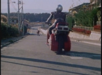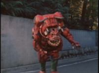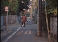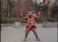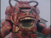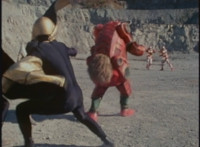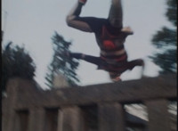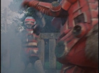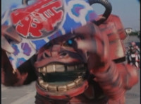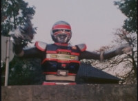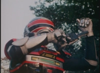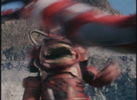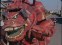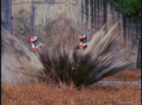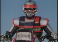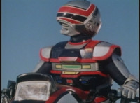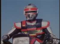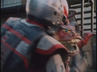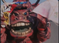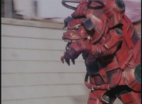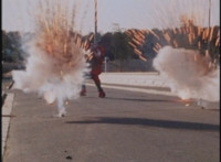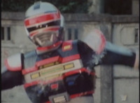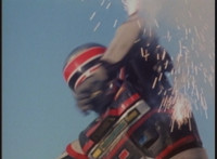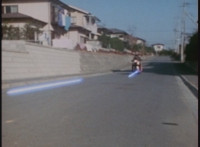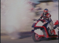 VR JB drives the Fighterbike after Serpentoid, who skates down the street, soon whipping out a piece of paper with colorful Japanese writing on it and tossing it into the air, where it whips past VR JB, bursting him. Serpentoid pulls out another kite-like paper product and throws it behind him, again bursting VR JB. Serpentoid keeps on skating, VR JB firing lasers from his Fighterbike, smoke bursting the ground around the mutant. |