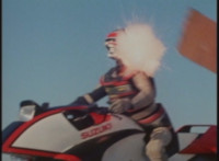 VR JB pulls out his Laser Pistol and fires into the air while riding his Fighterbike. |