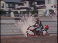 VR JB flips over and lands on the VR Fighterbike in midair and plainly flies forth. |