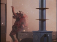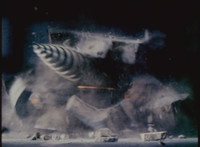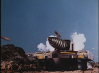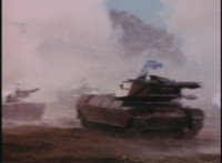 The tank armada fires upon VR Troopertron, bursting it, as they roll on through explosions. VR Troopertron staggers back, then suddenly straightens up and steps forth, stomping onto a tank with one foot, followed by a second with the other foot. A quick shot of a Skug pilot being squished. |