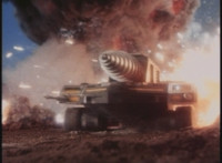 The Ravage Tank fires upon VR Troopertron, bursting its chest, before driving forth, causing VR Troopertron to stagger back, swiftly kicking the approaching Ravage Tank, turning General Ivar over in his cockpit, as the Ravage Tank rolls over the side of a cliff. |