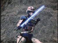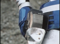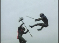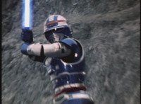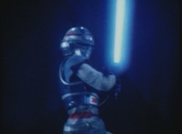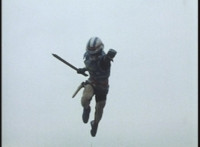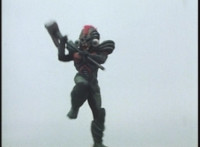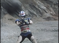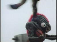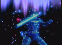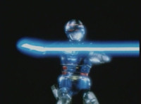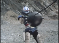 Transgressor leaps in striking his hammer, VR Ryan dives at him, bounces off his head, leaving him falling to the ground while VR Ryan lands atop the hill, where he poses quick, then leaps back off. Transgressor, now armed with a spiked metal ball on a chain, tosses it forth, hitting VR Ryan, knocking him down. When he lands, Transgressor keeps swinging his spiked ball overhead, keeping VR Ryan at bay, unable to use his saber, until he finally gets struck with it, spark bursting. Transgressor soon runs out of chain, the ball wrapped around his arm. |