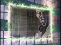 Karl Ziktor morphs into Grimlord, teleporting up to his Dark Fortress above, which floats through the virtual dimension. |