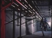 VR Ryan races down an empty corridor, reaching a wide area, when Transgressor leaps down and hits him in the back. VR Ryan falls, rolls, gets up, the mutant strikes at him with his drillarm, he grabs it, then gets flipped over. He recovers with a kick at Transgressor, then a dive dodge past the mutant's drill swipe. VR Ryan pulls out his Laser Pistol, zaps Transgressor, but it does no good, the mutant attacking him and beating him down. |