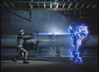 Transgressor attacks the panel on the wall with his drill, causing it to ignite and spark. |