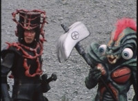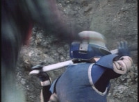 VR Ryan blocks Transgressor's hammer strike with his saber, then strikes back at him with a saber-butt smack, repeated twice more, sending Transgressor falling over into a lower area of the quarry, where Doommaster, the Vixens, and a gang of Ultra-Skugs regroup with him. VR Ryan lands atop the hill, and poses. |