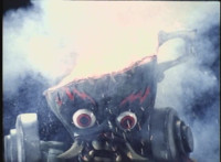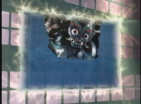 Karl Ziktor morphs into Grimlord, teleporting up to his Dark Fortress above, which floats through the virtual dimension. |