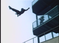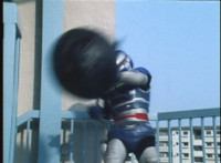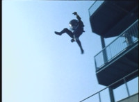 Cuts prior shot of VR Ryan leaping over Doommaster; transitions out; cuts a bunch more footage of VR Ryan fighting Athletetron that follows in source. |