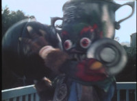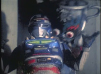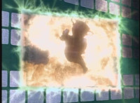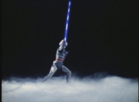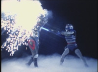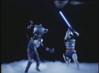 Athletetron readies his own saber, as he faces VR Ryan with his glowing one. They pace about for a moment, before the mutant goes to strike, so VR Ryan sparkily slashes him across the chest, then hits him again, causing Athletetron to turn around, where he gets sparkily slashed again. They reengage in combat, with VR Ryan snagging Athletetron's saber's dangling pearl necklace thing, using it to disarm him of his sword, before sparkily slashing him again. VR Ryan then thrusts forth, stabbing Athletetron sparkily through his trophy head, then pulling out, leaving him dazed. |