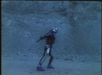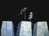 Athletetron grabs VR Ryan from behind, he struggles, breaks free, turns around, then gets knocked down. VR Ryan falls, rolls, recovers and spots Athletetron racing past him, so he fires his Laser Pistol at him, missing. Athletetron shows up behind him, sneaking by, so VR Ryan fires again, bursting the wall. Athletetron sneaks by suddenly from a different direction, so VR Ryan fires on him again and again misses. Suddenly, Athletetron punches VR Ryan in the face. Now, they're in a different dimension, consisting of three platforms. VR Ryan rushes out to the far left, Athletetron appears and pole vaults past him as he rushes toward him. VR Ryan turns around, and rushes at Athletetron again, slashing at his pole as he vaults past him again. |
