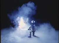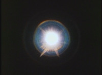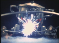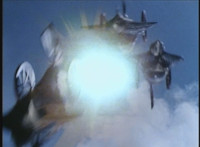 Rapid flashing of a blue burst, as a massive explosion fireball expands before us, briefly flashing blue, then back to normal, then again. |