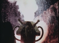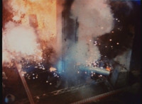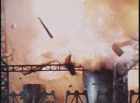 An explosion erupts upon a TARDIS console. Some more explosions amid girders and other construction structures. |