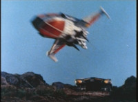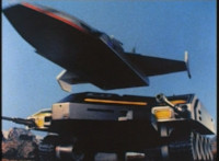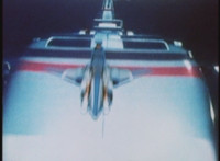 The VR Combat Module rolls forth, then comes to a stop. The Blue Hawk fighter jet flies off of the VR Combat Module, doing a full twirl in midair. |