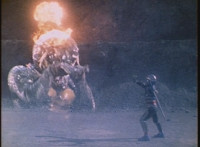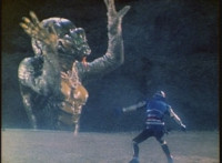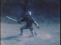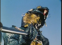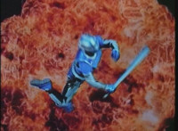 Giant Lizbot taunts VR Ryan, who backs up for a moment, then tries to strike, getting blasted by Lizbot's zapping, which bursts smokes and sparks all around, and upon, VR Ryan. He falls, rolls, gets back up, pulls out his Laser Pistol, and fires upon Giant Lizbot, exploding atop her head, causing her to drop into the Indigo Sector at normal size, ready with her staff. VR Ryan is prepared to resume battle, when he looks up suddenly, seeing Gargantus flying in, firing. |