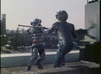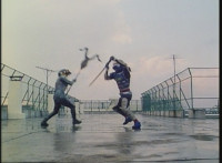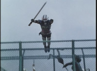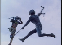 Doommaster motions forth, so Lizbot, the Vixens, and Ultra-Skugs charge into combat. VR Ryan readies his saber, then leaps down and fights his way across the rooftop, through Ultra-Skugs, Doommaster, Vixens, and finally Lizbot, facing her and two Vixens at once. VR Ryan suddenly leaps over the side of the fence, kicking down two Ultra-Skugs. He rushes over and continues to fight on the roof of a building. |
