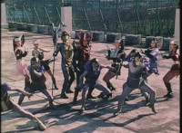 Lizbot jabs her staff forth at VR Ryan, who blocks it, she reacts, he breaks free, dodges a few more staff strikes, before leaping up and flipping onto the upper roof's edge, where he poses. Lizbot is joined by Doommaster, Vixens, and Ultra-Skugs in looking up at him. VR Ryan poses some more. |