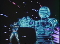 VR Ryan poses and gestures, as he creates a giant blue-grid hologram of himself. The shuttle transforms into the VR Shoulder Cannon, which the giant hologram wields and as VR Ryan squeezes the trigger, it does also, firing it forth. |