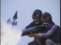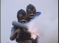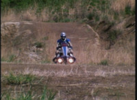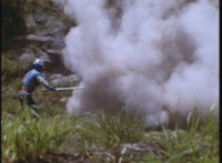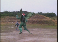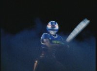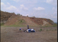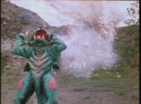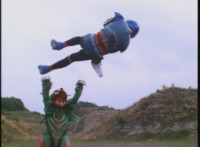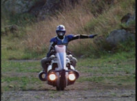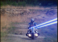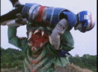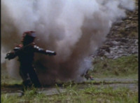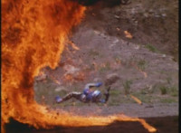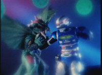 VR Ryan rides along on his VR Nitrocycle in a field, when two sets of three Ultra-Skugs appear on a nearby hillside, two of each set armed with bazookas. VR Ryan is oblivious, until they start firing upon him, dirt bursting around him but failing to hit him even once. VR Ryan motions his left arm about, and fires lasers from his VR Nitrocycle, bursting the six Ultra-Skugs, then doing the same again with same results. VR Ryan glances about, and spots Charmador hobbling through the field by himself. So VR Ryan buckles down on his VR Nitrocycle and rides at Charmador, firing lasers at him. The bolts are reflected back, bursting around the VR Nitrocycle until VR Ryan is thrown off. |