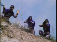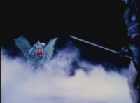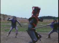 Cuts before three robed demons attack him; cuts follow-ups of them fighting him. |